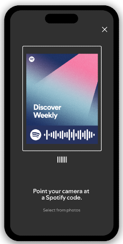 Die Fans öffnen die Spotify , tippen auf die Suchleiste und dann auf das Kamerasymbol in der oberen rechten Ecke. Von dort aus können sie ihre Kamera auf Ihren Code richten, um ihn zu scannen.