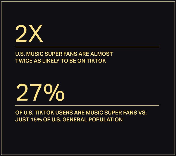 - TikTok in den USA sind fast doppelt so häufig Musik-Superfans (27 % gegenüber 15 % der Allgemeinbevölkerung)