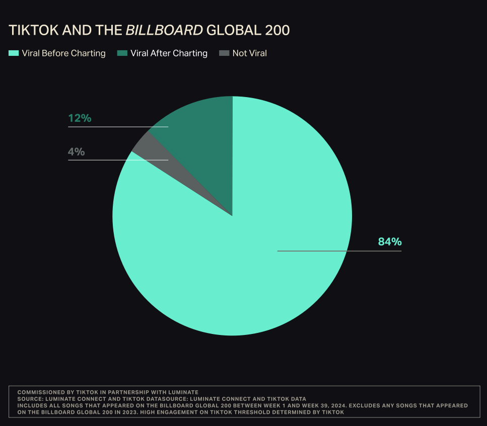 - 84 % der Songs, die im Jahr 2024 in die Billboard Global 200 aufgenommen wurden, gingen zuerst auf TikTok viral